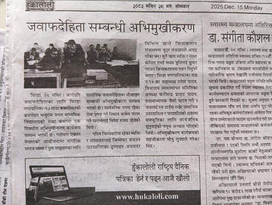 सिरहा, २८ मंसिर । कार्यप्रति जवाफदेहिताका लागि सिरहा नगरपालिका- १७ माडर बजारस्थितको ब्रजमोहन झबुराम जनता माध्यमिक विद्यालयको सक्षा कक्षामा एक दिवसीय अभिमुखीकरण कार्यक्रम सम्पन्न भएको छ ।
